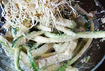 À l'aide d'une mandoline, couper les courgettes et la pomme verte en Julienne (spaghetti). Mélanger tous les ingrédients (courgette, pomme, peso et zeste), laisser reposer un minimum de 30 minutes au frigo et servir. Au moment de servir déposer les pousse sur le dessus.