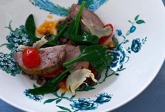 Abrité au sein d'un bâtiment du XVIIIe siècle de style Art Nouveau, Le Dôme surprend par sa configuration. La salle du restaurant, chaleureuse et lumineuse, est un havre de paix réconfortant. Rapidement, l'attention se porte sur les assiettes : pour patienter, avec un verre de pétillant naturel vif de Ludovic Chanson (Montlouis-sur-Loire), nous sommes mis en appétit par un brocoli saupoudré de poivre long mélangé et accompagné de pieds bleus (champignons), ainsi que d'une crème de pain brûlé. Ici la place au produit brut est essentielle, la magie du chef faisant le reste pour nous le faire découvrir sous un nouveau jour. Arrive un délicieux saucisson maison sur une fine biscotte et un verre de Chenin blanc sec de Pascal Pibaleau (Touraine), fin et léger. Puis les plats s'enchaînent. Estouffade de morilles, calamars à la plancha, lard & pissenlit. Je fonds, j'aime ce mélange terre-mer. Saucisse de Morteau (maison), artichaut, tomates cerises & lentilles. Je rougis de plaisir, l'assiette est sublime, les goûts explosent en bouche, de nouveau ce petit air marin amené par l'aster maritime - cet "épinard de mer" - me réjouit. Cabillaud, purée à l'ail des ours, radis, pommes de terre & betteraves jaunes, un plat si simple d'apparence, croquant, et sublimé par une incroyable vinaigrette de betterave.