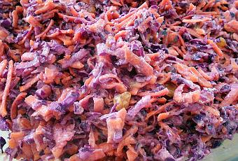Pour 1 gros saladier : 1/2 choux rouge, une dizaine de carottes, 1 grosse poignée de raisins secs blonds, 2 yaourts natures, 2 cs bombées de SAVORA, 2 cs de vinaigre de cidre, sel, poivre