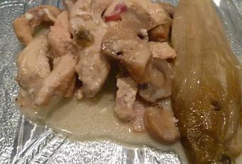 Emincer le poulet et le faire dorer dans une sauteuse munie d’une feuille de cuisson.