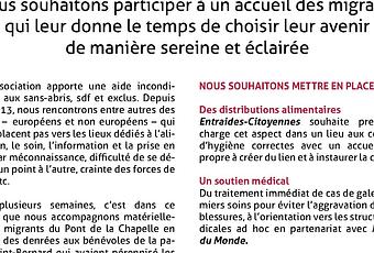 Depuis lors, nous interpellons les élus pour qu'un espace de jour soit ouvert de toute urgence et de manière pérenne pour y accueillir sereinement les migrants qui le souhaitent à l'écart de ceux qui les entraînent - parfois au détriment de leur sécurité - dans des formes revendicatives dont nous nous sommes très rapidement désolidarisés.