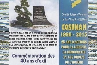 2015 est en fait un triple anniversaire, celui de cet exil, à la suite de la chute de Saïgon le 30 avril 1975 et, à partir de cette date funeste, de l'extension du pouvoir communiste sur tout le territoire du Vietnam; ceux subséquents de la création du Comité Suisse-Vietnam, Cosunam, en 1990, et de l'érection d'une stèle au Grand-Saconnex, dans la République et Canton de Genève, en mémoire des boat-people, en 2005.