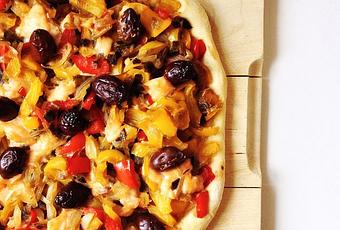 Quand la poivronnade-oignonnade est prête, mettez le four à préchauffer à 200°C. Farinez une plaque de cuisson et un plan de travail. Pesez la pâte à pizza de façon à n’en prélever qu’une boule de 250 g (elle est collante, pas de panique, c’est normal), puis farinez-en toute la surface afin de l’étaler-la au rouleau (sur le plan de travail), de façon à former un épais rectangle aux bords arrondis d’environ 20 x 30 cm.