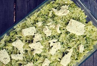 2) Disposez vos courgettes coupées / émincées ou râpées au fond de votre plat (un plat qui devra aller au four). Préchauffez votre four à 180° (th 5).
