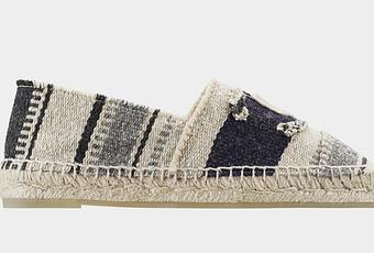 Pour la saison printemps-été 2015, Chanel réinterprète la chaussure basque par excellence : l’espadrille. La toile est rayée de beige, de bleu et de gris et porte, sur le coup de pied, la célèbre signature CC.