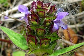 Prunella vulgaris, Brunelle commune : faiblement pubescente, tige quadrangulaire peu feuillée, feuilles entières opposées, inflorescence en épi globuleux à cylindrique, avec une paire de feuilles à sa base, petites fleurs bilabiées bleu-violet, lèvre inférieure à 3 lobes.