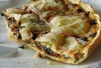 - Répartir la préparation aux épinards sur le fond de tarte, arroser avec le mélange oeufs/lait et recouvrir avec les tranches de fromage à raclette.
