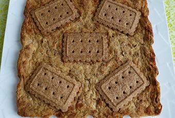 Mélanger tous les ingrédients secs (sauf les biscuits) puis ajouter le tofu (fouetté au préalable) et la compote.