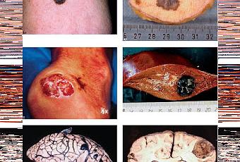 A1. Aspect macroscopique tumeur noire à contours irréguliers, polychrome.A2. Exérèse cutané d’un mélanome (noter la présence d’un petit naevus naevo cellulaire à l’extrémité gauche du fragment cutané).B. Mélanome achromique de la cheville à un stade avancé (type acro-lentigineux).C. Métastase hépatique.D et E. Métastases cérébrales d’un mélanome.Source iconographique et légendaire: http://campus.cerimes.fr/anatomie-pathologique/enseignement/anapath_11/site/html/1.html