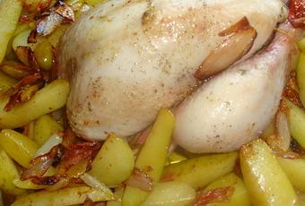 4. Disposez les coquelets, les pommes de terre et les oignons dans un plat allant au four et laissez cuire le tout à 180 °C pendant 30 minutes. Arrosez régulièrement de jus de cuisson.