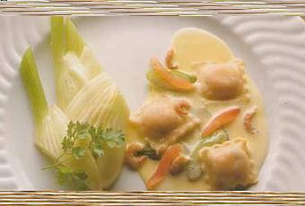 Fiche technique : Raviolis de crevettes en sauce au cerfeuil sur lit de fenouil