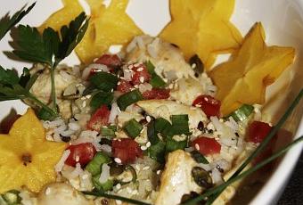 Lorsque le poulet est cuit, server en mélangeant le poulet, la sauce avec du riz, ajouter quelques dés de tomates et décorer avec quelques tranches de carambole.