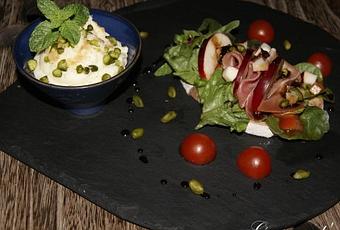 Disposer la tranche de jambon, la pomme et les pistaches.