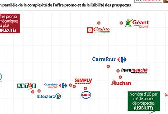 En collaboration avec A3 Distrib, le spécialiste de la distribution Oliviers Dauvers a publié sur son blog un graphique illustrant la facilité (ou non) à comprendre les promotions des enseignes. Sur l’axe horizontal figure le nombre de référence par mètre carré de prospectus. On peut déjà deviner qu’au-delà de 160, soit environ 10 produits sur une page format A4, cela devient dur à déchiffrer… Or c’est le cas en moyenne chez Monoprix, qui affiche plus de 170 références par mètre carré. Sans doute un bon moyen d’économiser du papier, mais pas les yeux de ses clients.