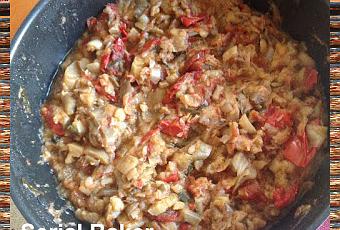Dans une sauteuse, placer trois cuillères à soupe d'huile d'olive, ajouter les oignons. Recouvrir avec les morceaux d'aubergine. Faire cuire à feu moyen à couvert en remuant de temps en temps. Quand les aubergines commencent à être tendres (au bout de 15-20 min environ), ajouter les morceaux de tomate et poursuivre la cuisson en couvrant la sauteuse aux trois-quart. Remuer de temps en temps, et cuire jusqu'à ce que les tomates soient bien cuites. Enlever le couvercle, ajouter deux bonnes pincées de thym et mélanger. Laisser cuire encore 5 min à découvert en remuant de temps en temps.