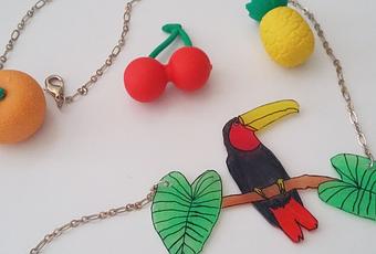 J'ai dessiné - ou plutôt repassé les contours d'un joli toucan issu d'un album à colorier- sur une feuille de plastique fou, ensuite colorié aux crayons de couleur l'envers (mate) du plastique, refait les contours au feutre fin noir et enfin découpé le bel oiseau. Deux petites perforations pour les futures attaches et hop au four pendant quelques minutes à 150°C : le pendentif est prêt à être utilisé.
