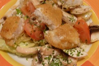 Mettre dans une assiette le salade, les champignons, les tomates coupées en quartier, les oignons et par-dessus les poissons panés coupé en morceaux, versez la vinaigrette dessus.