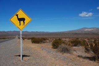 Nos premiers lamas traversent la route. Au debut, on s'arrete, on leur parle, on les photographie comme des stars... Par la suite, on en croisera tellement que nous n'y preterons plus aucune attention. Apres une route de tole ondulee nous arrivons a la Laguna Portezuelo. Nous sommes a plus de 4 000m d'altitude : il y a du vent, il fait froid, la lagune n'est pas aussi belle qu'on nous l'avait promis... On repart, mais cette fois-ci avec une auto-stopeuse en costume traditionnel. Elle enchaine quelques phrases en espagnol, on arrive a peu pres a la comprendre... Ravie d'avoir affaire a des etrangers, elle nous apprend le nom de tous les animaux qu'on croise.