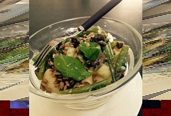 Avec les restes du frigo d’hier : des pâtes, des haricots verts, des graines grillées maison, des gros câpres,un reste de mozzarella et quelques feuilles de basilic, voici la recette idéale pour un repas léger au déjeuner, au diner, au bureau, en pic nic. C’est simple, sain, rapide à préparer et économique. Elle est pas belle la vie que vous simplifie y’a quoi dans mon frigo ? Après je vais me faire une petite faisselle de brebis avec un café expresso ristretto et je peux vous dire que je crois que je vais bien travailler aujourd’hui.