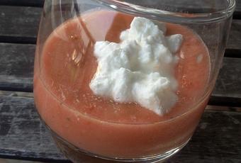 Au moment de servir : couper la ricotta, servir le gaspacho dans des verres ou verrines et déposer des morceaux de ricotta dessus.