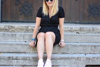 Photos: Marion=> Robe Noire Clo&Se By Monshowroom => Baskets Rose Stan Smith Adidas x Raf Simons => Sac Rose Sabrina via Le Forum des Sacs=> Lunettes de Soleil So Real Dior