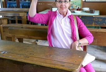 Benjamin a toutefois été fasciné par la vitesse de rotation du tour à bois et nous lui avons acheté la toupie qu'il venait de voir tirée d'un bloc rectangulaire. Le potier nous a montré en un tour de main - et c'est bien le cas de le dire - un petit pot de céramique, et le bourrelier comment confectionner une ceinture avec de très beaux outils tranchants. ... Bien entendu, nous n'avons pas échappé à la fidèle reconstitution de la classe du début de siècle avec ses chromos et ses pupitres à encriers. J'ai essayé de me plier à la posture difficile des lavandières ... C'est bien fait, avec pas mal de personnel pour animer ces décors dignes d'un film. On sent la préoccupation pédagogique ... et ludique aussi avec la chenille, très années 30 mais telle je me souviens de celles de la Foire du Trône à Paris, dans les années 50.