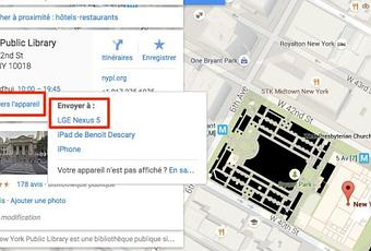 Une fois que cette mise à jour a été effectuée, rendez-vous sur la version Web de Google Maps. Comme d'habitude, recherchez une adresse. Dans la fiche de votre adresse qui s'affiche à l'écran de votre ordinateur, vous remarquerez la présence d'un lien qui se nomme "Envoyer vers l'appareil".
