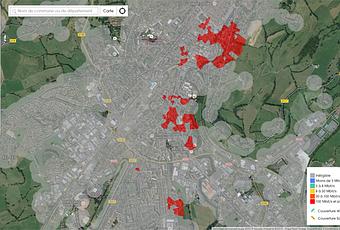 On peut ainsi voir qu’Aurillac a commencé à déployer le FTTH dans certains quartiers de la ville (CF carte ci-dessus). On voit aussi la couverture VDSL qui permet d’atteindre les 100Mbit/s en étant proche des centrales téléphoniques (AUA et AUB) ou des DSLAM (Baradel).