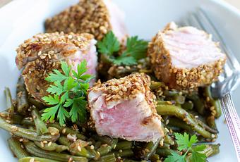 Thon mi-cuit au miel et sésame, poêlée de haricots verts 2015-07-17 16:20:38 En marinade, sucrée-salée ! Sauvegarder Imprimer Temps de préparation 1 hr 15 min Temps de cuisson 15 min Total Time 1 hr 30 min Temps de préparation 1 hr 15 min Temps de cuisson 15 min Total Time 1 hr 30 min Pour la marinade- 4 pavés de thon de 150g chacun
