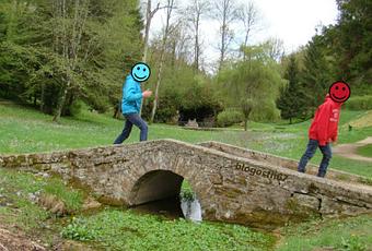 Pont_Paul_Lamarche_Source_SeineZébulon et Tilou traversent fièrement le pont Paul Lamarche. De nombreuses personnes traversent également des ponts qui passent au-dessus de ce même cours d’eau, sauf que Zébulon et Tilou marchent sur le premier pont de la… Seine ! En arrière plan, un nymphée nous attend.