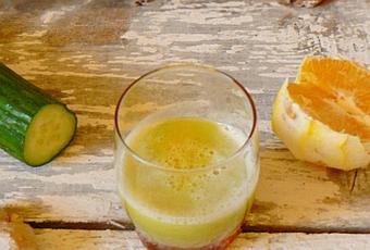J'ai pressé 1/2 concombre + 1/2 orange + un petit morceau de gingembre (petit car très fort en goût!)