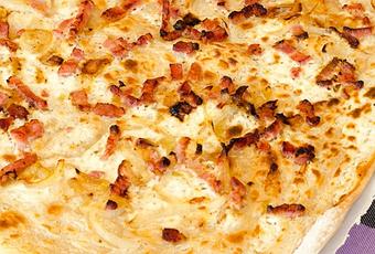 Poser une couche de ce mélange sur la pâte. Garnir d’oignons et lardons.