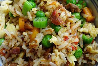 Ajoutez le riz, mélangez bien, mouillez avec le vin de riz shaoxing, salez avec la sauce de soja.