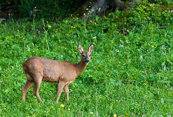 Méfiance et tolérance… Ca pourrait être le titre d’un roman policier de supermarché, mais cela résume surtout bien l’attitude de cette chevrette observée il y a quelques mois déjà dans les bordures de la réserve du Creux-du-Van. Installé au pied d’un arbre en fin de soirée en espérant voir surgir un habitant des forêts, c’est finalement une chevrette qui est apparue à pas de loups dans la clairière. Son premier regard fût pour moi, et elle ne me quitta pas des yeux durant de longues minutes. Après avoir soigneusement évalué la menace, la chevrette s’est progressivement détendue et s’est mise à brouter en prenant soin de jeter un coup d’oeil dans ma direction de temps à autre…