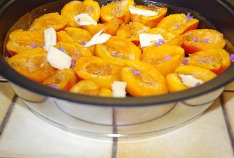 Disposer dessus les demi-abricots, côté bombé contre le moule, en les serrant bien.
