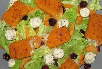 Cuire les poissons panés dans une poèle antiadhésive. Les couper en trois et les disposer sur la salade.