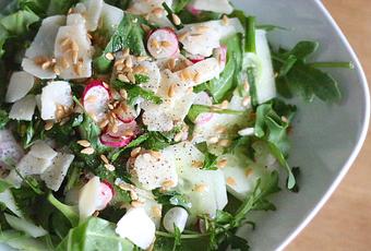 J’ai mélangé une grosse poignée de roquette (j’adore son côté poivré), coupé en rondelles quelques radis et un quart de concombre.