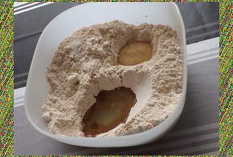 Faire deux trous dans le mélange "farine", dans un ;mettre l'huile et dans l'autre, le vinaigre de pommes sans aucun débordement!