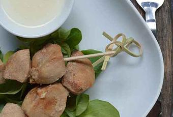 Servir les brochettes accompagnées d'un peu de salade et de la sauce au comté.