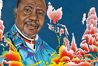 Chéri Samba, La vraie carte du monde, 2011, Acrylique et paillettes sur toile, 200 x 300 cm, Collection Fondation Cartier pour l’art contemporain, Paris, photo © Florian Kleinefenn © Chéri SambaLa vraie carte du monde nous rappelle les affiches de propagande communistes chinoises et /ou russes. Pas de drapeau national juste cette carte du monde revisitée en toile de fond qui hisse l’auteur au rang des grands dirigeants contemporains. Cette mise en abîme de l’art dans le politique s’appuie sur l’ouvrage Mes étoiles de LilianThuram, et remet en question la place centrale de l’Europe dans l’Histoire.Cette œuvre subversive trouve écho dans les propos de Chéri Samba : « Je me sens une dette envers mon peuple. L’Afrique a besoin de ses intellectuels, de ses artistes. Un pays sans artiste est un pays mort. » (Propos recueillis par André Magnin en 2002 et 2003 à l’occasion de plusieurs conversations avec l’artiste à Paris et à Kinshasa. Extraits du catalogue de l’exposition.)