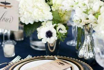 Ce décor de table est tout simplement parfait ! Nous avons ici, la profondeur du bleu roi, la brillance de l'or, l'éclat de l'argent, la pureté du blanc et la transparence du verre. Comment ne pas être conquis devant cela ? Deux éléments ont retenu notre attention : les vases en métal argenté et les assiettes blanches ou transparentes avec liserés dorés.