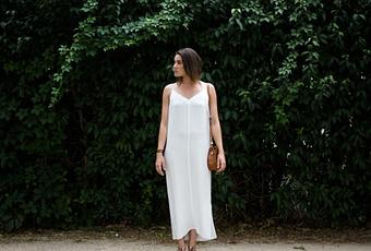 J’adore cette robe fluide à la forme cocon, ses fines bretelles et sa découpe en V devant/derrière. Et si je suis incapable de supporter la moindre étole sur mes bras en ce moment, je suis certaine qu’à la mi-saison, avec mon perfecto, le rendu sera canon ! Voici donc ma façon de porter le total look blanc, tel quel, avec juste des accessoires dans des tons de camel.