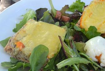 Disposer la salade dans l'assiette, ajouter des cubes de jambon grillé, des tartines de fromage et un oeuf poché.