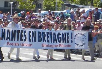 C'est ainsi que la question de la réunification de la Bretagne, enterrée de main de maître par le front des jacobins de tous bords et des notables archaïques accrochés à leurs petits pouvoirs, fit une nouvelle apparition dimanche dernier lors de la Grande Parade à travers les rues de Lorient. Grâce aux infatigables militants locaux de Bretagne Réunie, deux banderoles pour la réunification ont ainsi pu intégrer le très médiatique défilé et tout ceci avec la bénédiction de Lisardo Lombardia, directeur du FIL. Ouvrant la marche aux bagadoù de Nantes et de Saint-Nazaire ainsi qu'au cercle de Clisson, les deux banderoles ont recueilli énormément d'encouragements et d'applaudissements de la part du public....jusqu'au moment où.....la police les empêcha d'entrer dans le stade du Moustoir où se déroulait le final....Sur ordre de qui ? pour quelles raisons ? Mystère pour l'instant .... On peut simplement supposer que certains ne souhaitaient pas indisposer les VIP installés dans la tribune présidentielle.... Le dossier "réunification" serait-il devenu tellement "sulfureux" et politiquement incorrect ? On dirait bien .....