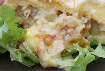 Déposer dessus les pommes de terre coupées en rondelles, l'émincé de poulet et d'oignon.