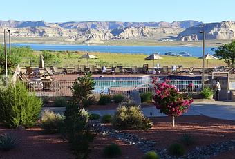 Après une courte mauvaise nuit à cause de la climatisation très bruyante, on se réveille vers 6h45 pour partir après un rapide petit-déjeuner dans la chambre vers 7h45. On a réservé à 9h pour visiter Antelope Canyon, il ne faut pas être en retard! Le parc de l'hôtel est très calme et agréable, la vue sur la piscine et le lac idyllique, mais pas le temps d'en profiter (ce sera une régulière frustration de ce voyage éclair)