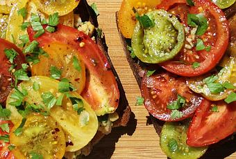 Pour les tomates :500 g de belles tomates mûres (de préférence de variétés « anciennes » et de différentes couleurs)1 gousse d'ail, finement hachée1 cuillère à café de sumac (en épicerie fine)½ cuillère à café de flocons de piment rouge½ cuillère à café de coriandre moulue½ cuillère à café de cumin moulu1 cuillère à café de sel1 cuillère à soupe d'huile d'olive
