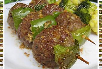 Une recette qui à beaucoup circulé sur les blogs et avec raison....les boulettes sont excellentes et la petite touche de sauce badigeonner dessus, leur donnent un léger côté sucré. J'ai pris cette recette chez mon amie, Nancy de Légende d'automne. Contrairement à elle, j'ai fais cuire au four et non sur le bbq, pour sa méthode, je vous invite à aller voir sur son blog, je vous laisse la mienne. Pour ma photo, j'ai mis des boulettes sur une broches en bois en alternant avec du poivron vert cuit.Boulettes: