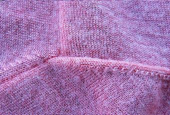 Donc aujourd'hui, je me régale, à mon échelle, à tricoter des pulls et des cardigans selon cette technique qui intervient comme un décor à part entière, consistant à pratiquer les diminution régulières bien visibles, à plusieurs mailles des bords, en tricotant sur les rangs endroit deux mailles ensemble à droite et un surjet simple (glisser la maille comme si on la tricotait sur l'aiguille droite, tricoter la suivante et passer la maille glisse sur la maille tricotée) à gauche. Ici, une séquence de 3 diminutions simples puis une diminution double pour une "pente" de raglan plus forte que 45°.