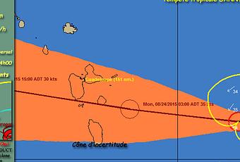 FORECAST POSITIONS AND MAX WINDS INIT 23/0900Z 15.8N 56.0W 50 KT 60 MPH 12H 23/1800Z 16.0N 58.0W 40 KT 45 MPH 24H 24/0600Z 16.5N 60.5W 35 KT 40 MPH soit 52 KMH 36H 24/1800Z 17.1N 63.1W 30 KT 35 MPH 48H 25/0600Z 17.8N 65.6W 30 KT 35 MPH 72H 26/0600Z 19.6N 70.5W 25 KT 30 MPH...POST-TROP/REMNT LOW 96H 27/0600Z 21.3N 75.0W 25 KT 30 MPH...POST-TROP/REMNT LOW 120H 28/0600Z...DISSIPATED